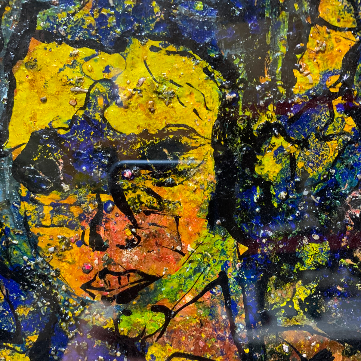 This is a 2013 artwork titled “The Bad Dream of Dripping in Blue” and is an semi-abstract painting by Alexander Gore.