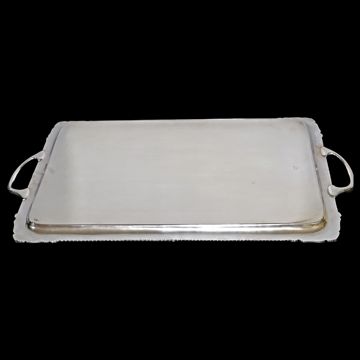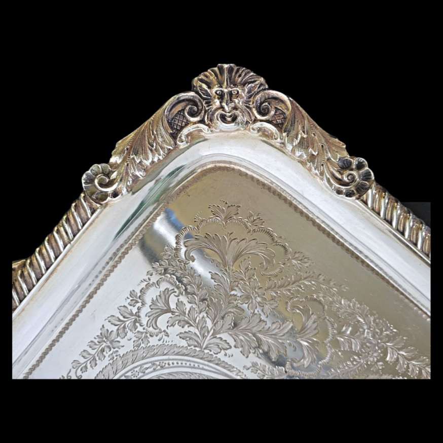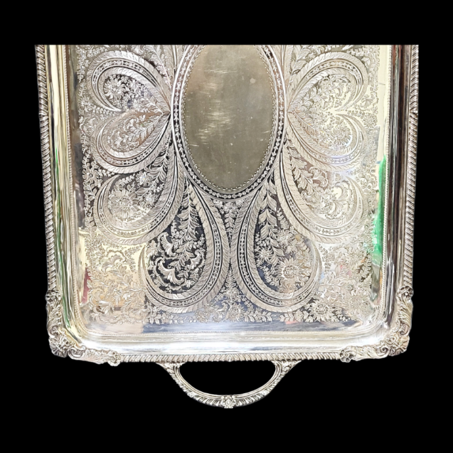 Description – A English Silver Plated Tray Stamped (A H.T) ”EP , NS & A1” . This rectangular tray features a deep set gadrooned border with Elegant Handles and is Decorated with fanciful Symmetrical Engravings of Floral and Filigree Designs Circling a center cartouche. The Quality and Craftsmanship throughout the piece are excellent. In great Antique Condition with minimal wear. Raised and numbered on the reverse. Be sure to view all the images to get a closer look at this classic tray.