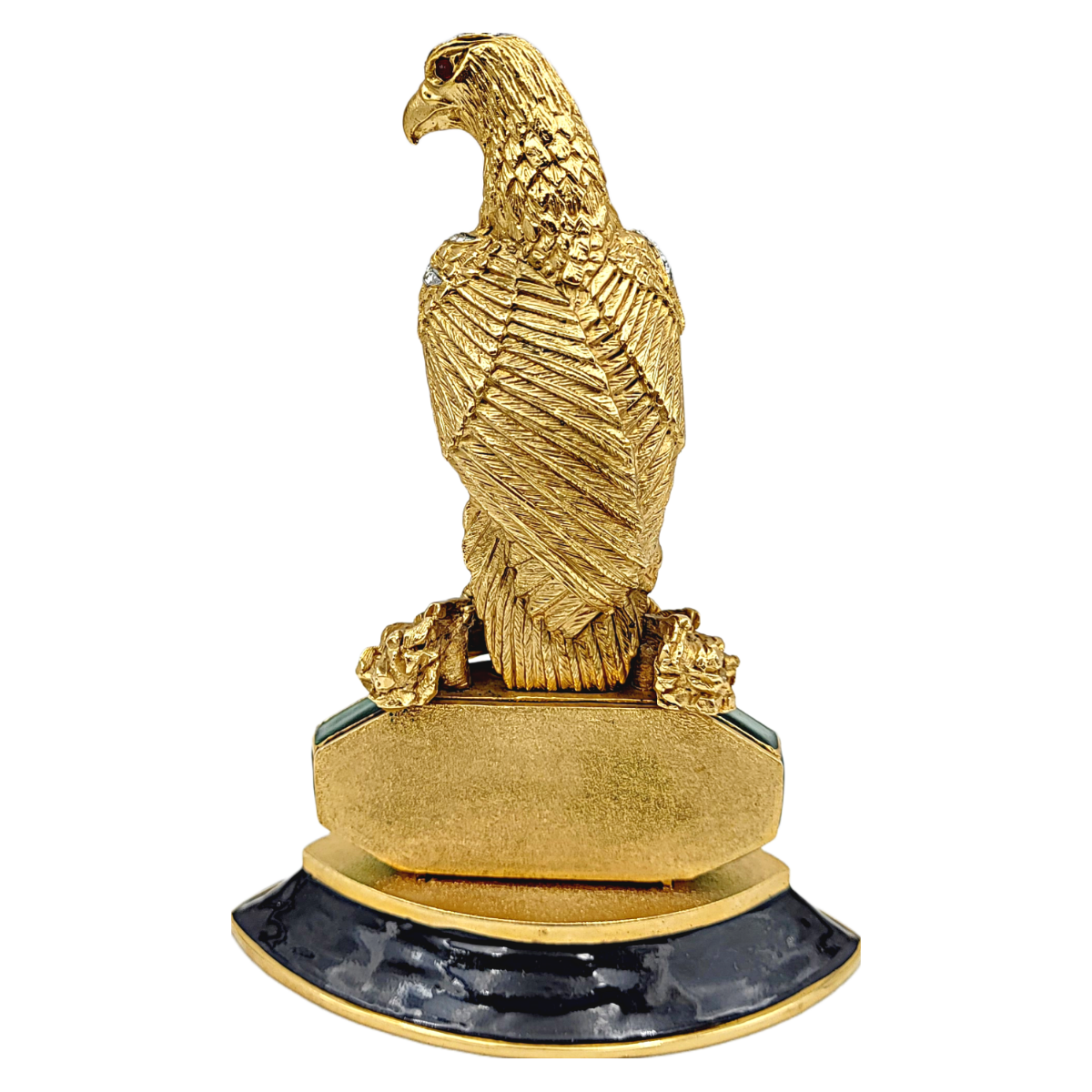 Description – Vintage Eagle Quartz Desk Clock with black and green enamel design with stones inlayed, Measures (H) 6′ x (L) 4′ x (W) 2′